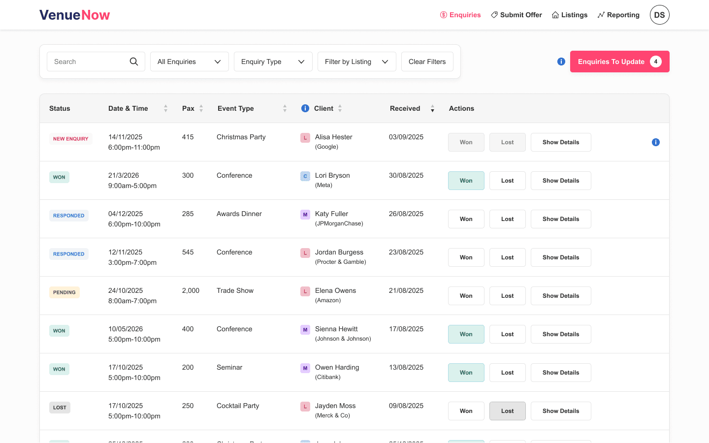 Professional event planners and agencies actively use VenueNow to discover and book venues and suppliers for their clients.