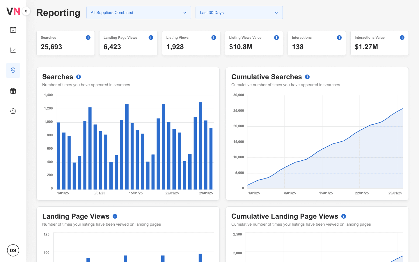 Live reporting dashboard with your performance metrics (searches, views, interactions).